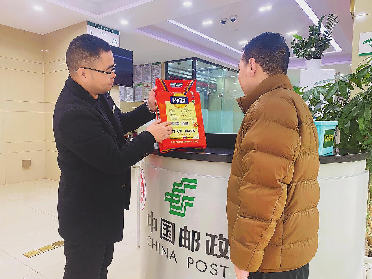 郵政工作人員為客戶介紹積分換購產(chǎn)品——內(nèi)江大米。