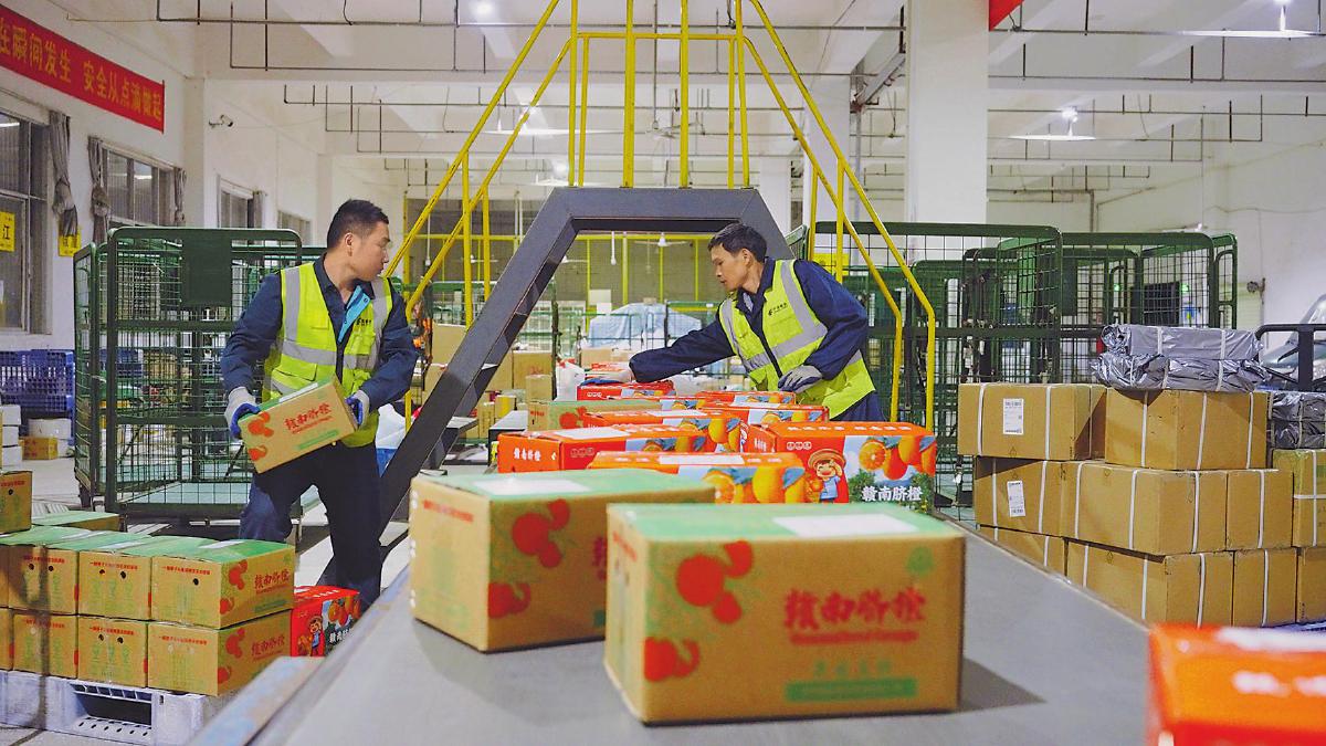 于都郵政寄遞物流共配中心迎來臍橙郵件處理高峰?!跛拘《 z