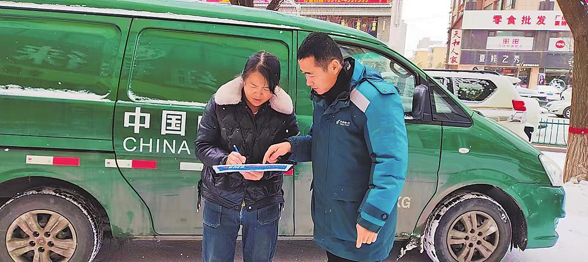 近日,陜西省榆林市定邊縣普降大雪,道路積雪結(jié)冰,給人們生活帶來(lái)諸多不便。而在各小區(qū)門口、社區(qū)門前都能看到郵政人忙碌的身影,他們一邊耐心地與客戶溝通,一邊迅速地卸下郵件,盡管被凍得手腳麻木,卻依然仔細(xì)核對(duì)每件郵件信息,確保郵件妥投,贏得了客戶的贊揚(yáng)。□吳巧蓉 攝影報(bào)道