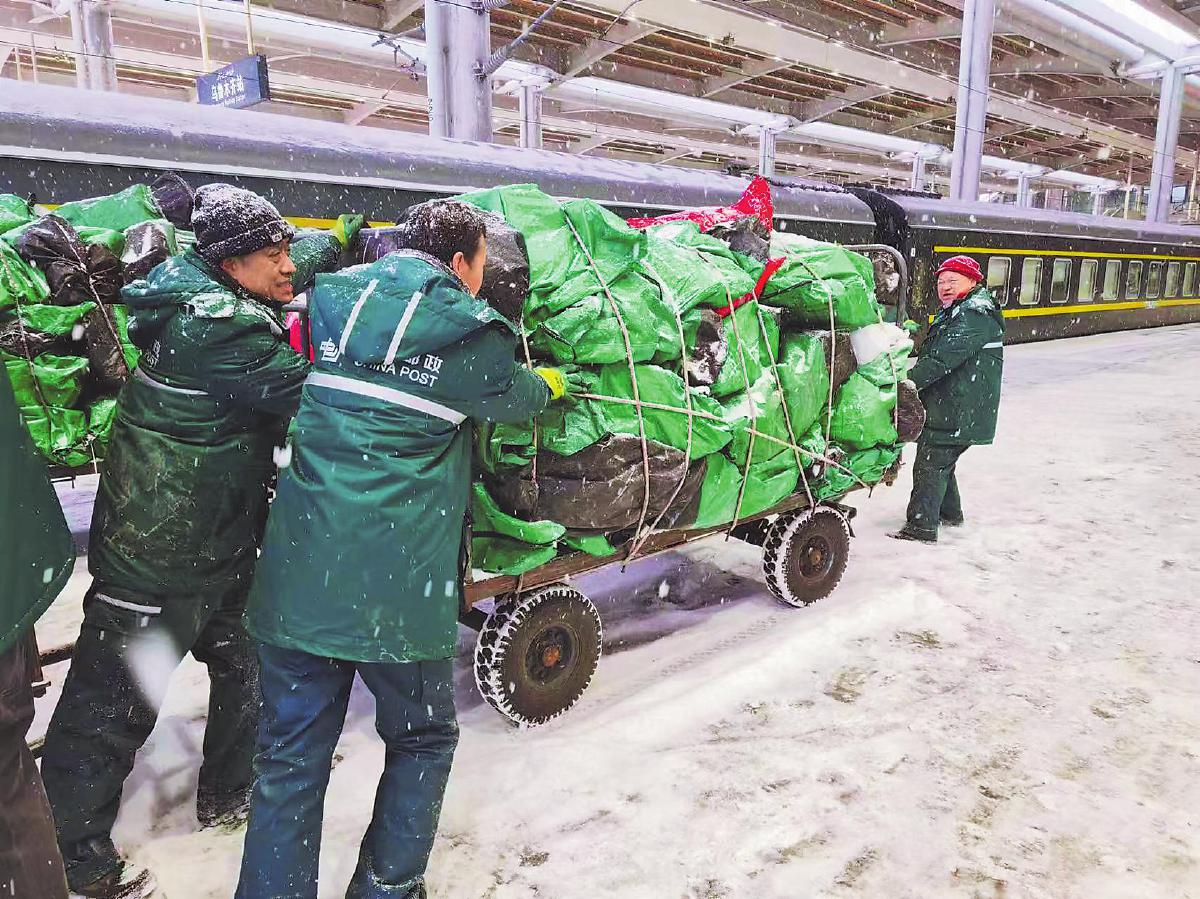 近日,新疆維吾爾自治區(qū)烏魯木齊市突降大雪,Z69次列車因此受阻,晚點(diǎn)半小時(shí)抵達(dá)烏魯木齊站。列車所掛郵政車廂裝載的400余件郵件急需轉(zhuǎn)運(yùn)。轉(zhuǎn)運(yùn)班組在僅有15分鐘的情況下,不畏嚴(yán)寒,緊密配合,按時(shí)完成了400余件郵件的卸車工作?!醯耘唷z影報(bào)道