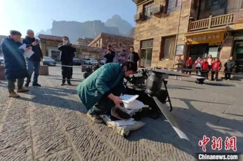 圖為無人機“郵遞員”降落在林州石板巖鎮(zhèn)中心廣場?!埧≤?攝