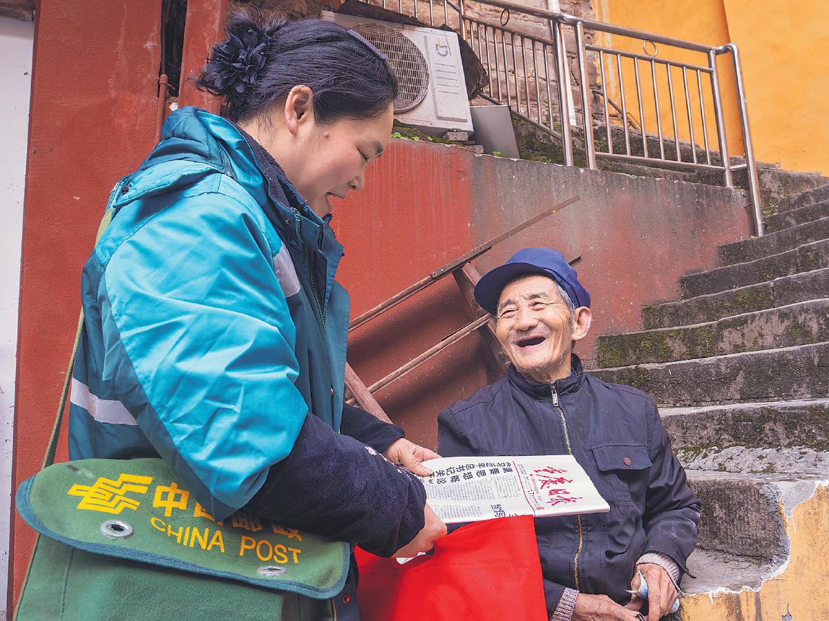 1月17日,重慶市武隆區(qū)郵政分公司投遞員穿越嚴(yán)寒給客戶送上黨報?! 跬踅鹎f 攝