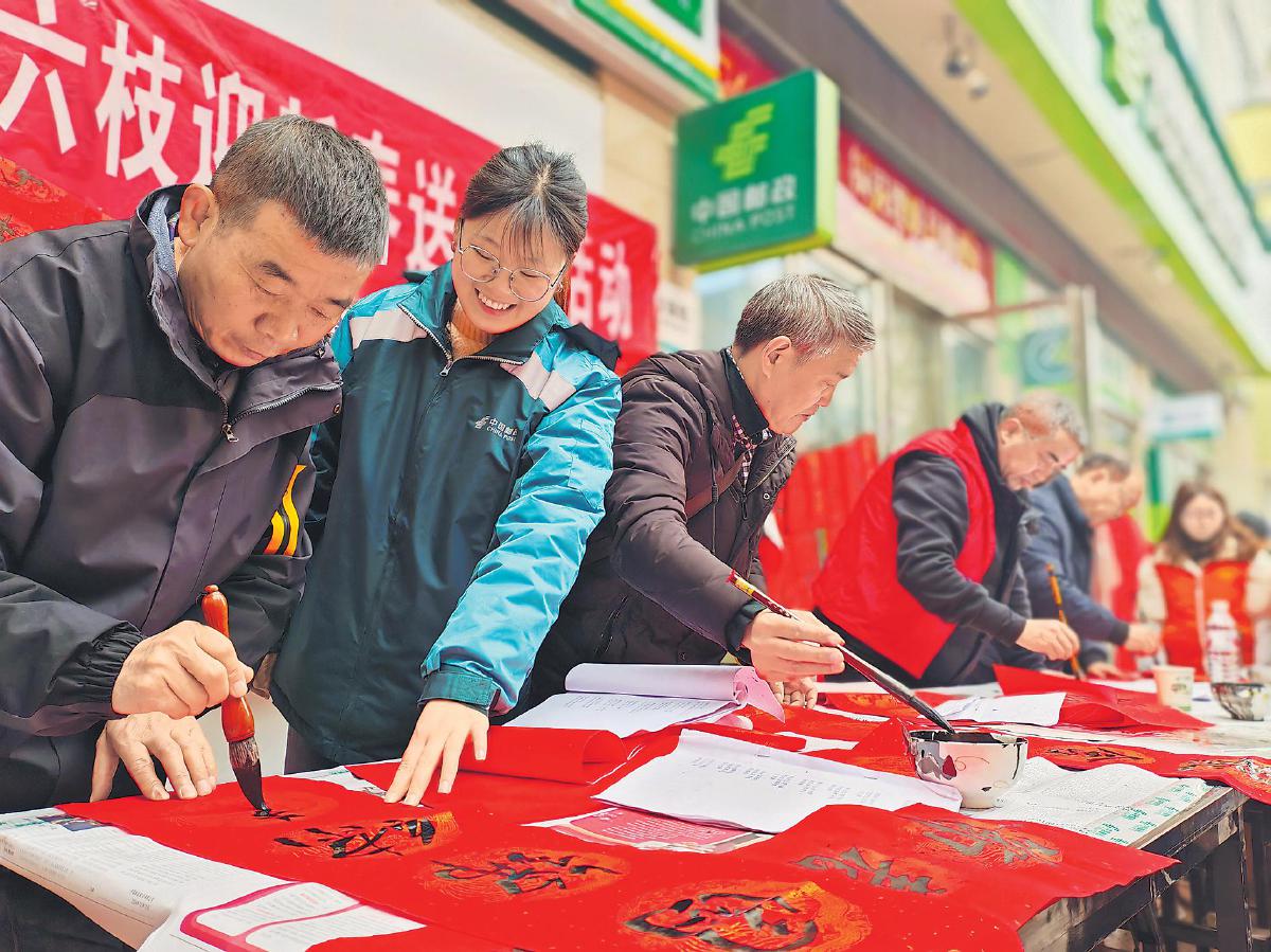 春節(jié)前夕,貴州省六盤水市六枝特區(qū)郵政分公司攜手特區(qū)總工會和特區(qū)書法家協(xié)會舉辦“筆走龍蛇祈平安,翰墨飄香迎新春”活動,免費(fèi)為群眾寫“福”字、送春聯(lián)?! 踉k 攝