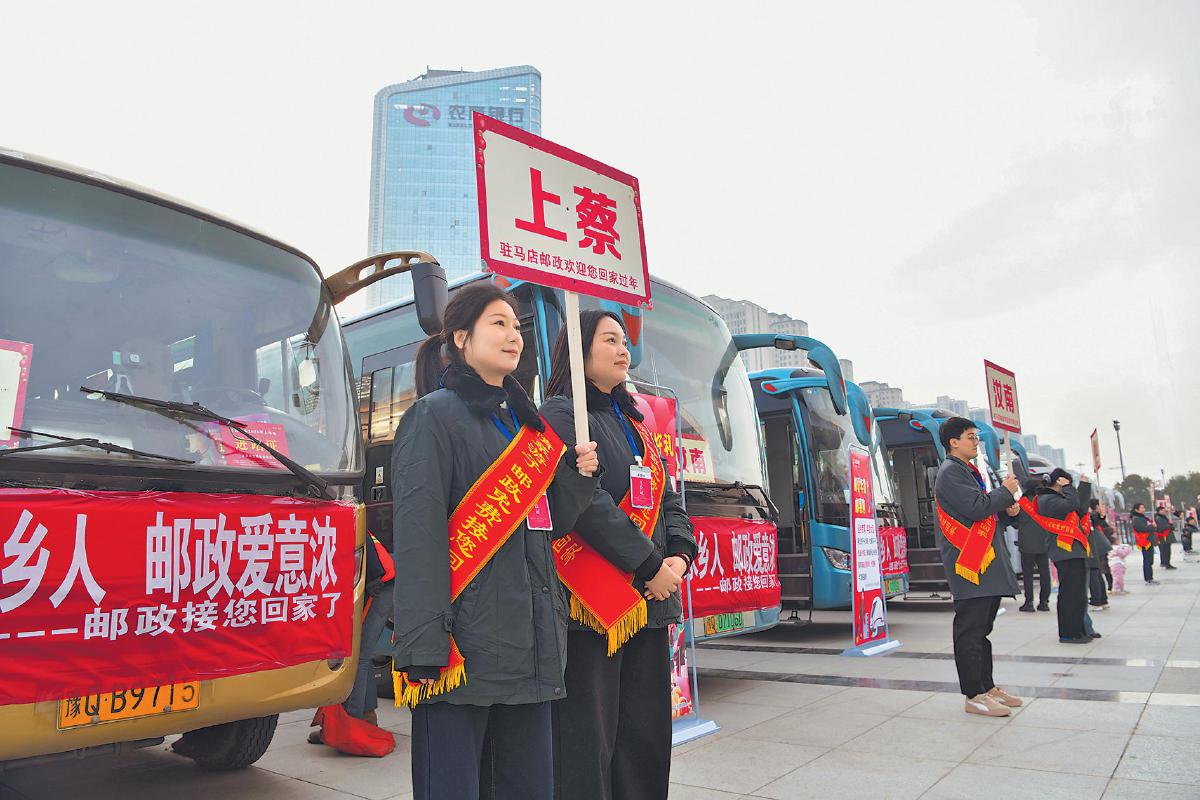 1月21日—27日,河南省駐馬店市郵政分公司開展“情系游子,郵政免費(fèi)接您回家”活動。圖為郵政員工在駐馬店西站熱情歡迎返鄉(xiāng)游子?! 踬Z紅偉 攝