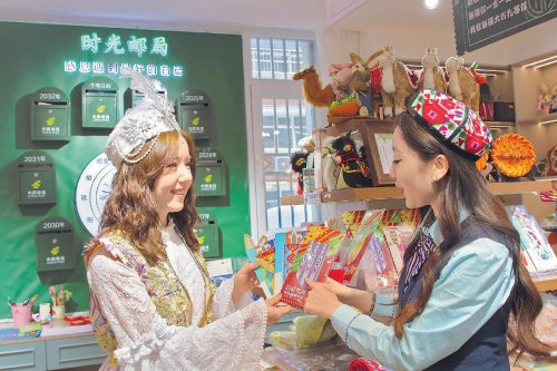 走進(jìn)大巴扎主題郵局,琳瑯滿目的文創(chuàng)產(chǎn)品吸引了眾多游客駐足觀賞、購(gòu)買。整面墻的新疆風(fēng)光明信片和醒目的“時(shí)光郵局”4個(gè)字最先抓住游客的眼球。來(lái)自全國(guó)各地的年輕人將對(duì)未來(lái)的期待、對(duì)生活的感悟、對(duì)親人的思念,寫在信紙上裝入信封,投入“時(shí)光郵局”的信箱,寄給未來(lái)的自己,充滿儀式感。