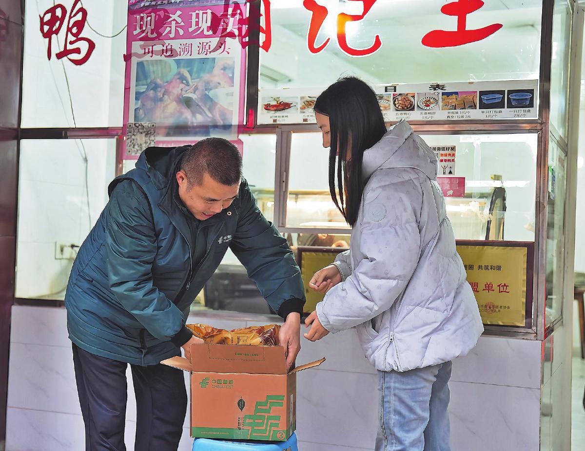 在熱門的樂山甜皮鴨店,郵政攬投員主動(dòng)上門攬件,幫助游客實(shí)現(xiàn)“即買即寄”旅行零負(fù)擔(dān)?!鹾斡铨垺z