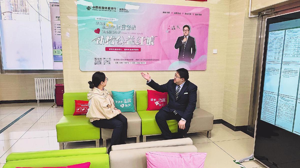 褚戈(右)向客戶介紹紅娘特色支行的服務(wù)。