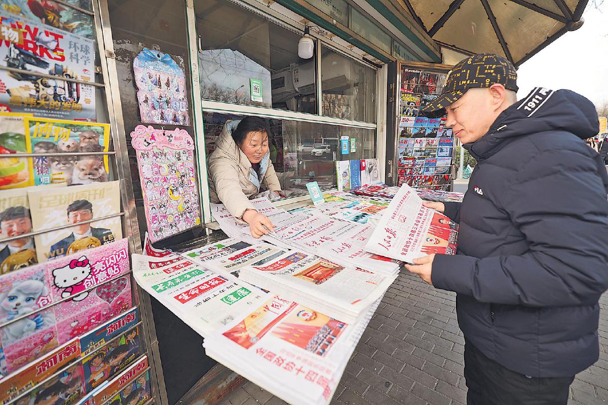 2025年全國兩會召開以來,各地郵政全力以赴做好黨報黨刊投遞工作,確保兩會精神及時傳遞到基層。北京市郵政分公司精心組織,報刊發(fā)行局成立服務專班,設立分發(fā)專區(qū),嚴控各環(huán)節(jié)時限;員工提前到崗,每日加密投遞頻次;開辟“專人專車、隨到隨送”綠色通道,實現(xiàn)重點區(qū)域報刊亭“當日見報率”達100%。圖為北京西城區(qū)廣安門外大街報刊亭“兩會專架”前,市民一大早就來駐足翻閱、購買最新的刊載有兩會報道的《人民日報》等報紙。