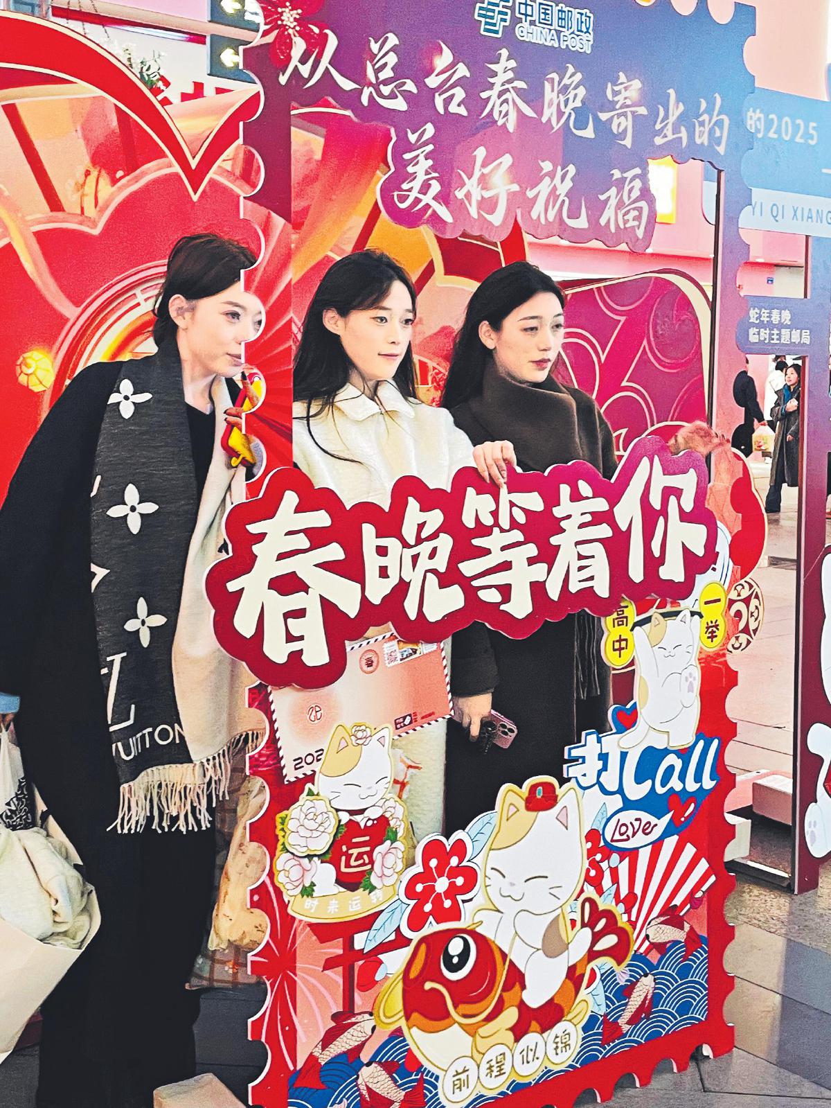 在成都市熱門(mén)景點(diǎn)春熙路步行街,中國(guó)郵政“春晚寄?!苯志按蚩c(diǎn)吸引往來(lái)游客爭(zhēng)相合影留念。□龔靜琳 攝