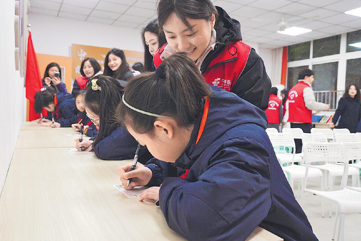 少年郵局內(nèi),重慶郵政青年志愿者指導(dǎo)小朋友書(shū)寫(xiě)明信片。