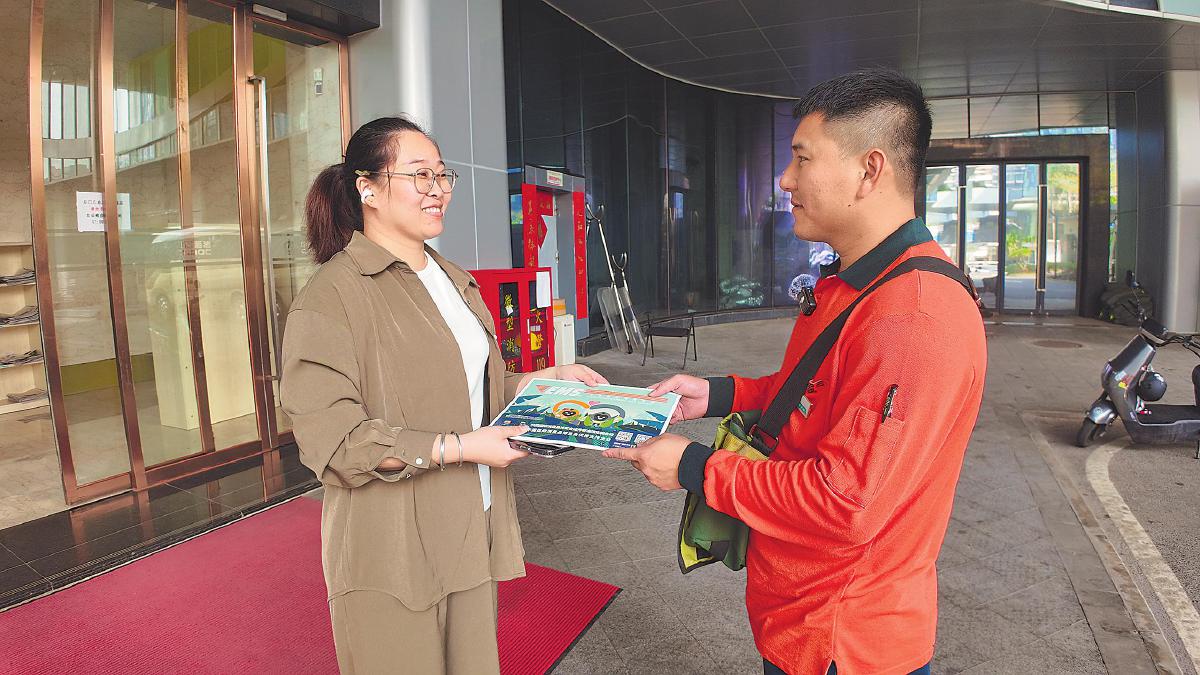 圖為投遞員將消博會(huì)證件郵件送交??诳蛻赳R女士。