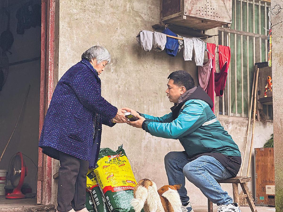 廣安市郵政分公司投遞員一大早將化肥送到農(nóng)戶家中,農(nóng)戶端出一杯水表示感謝?! 鮿㈦p華 攝