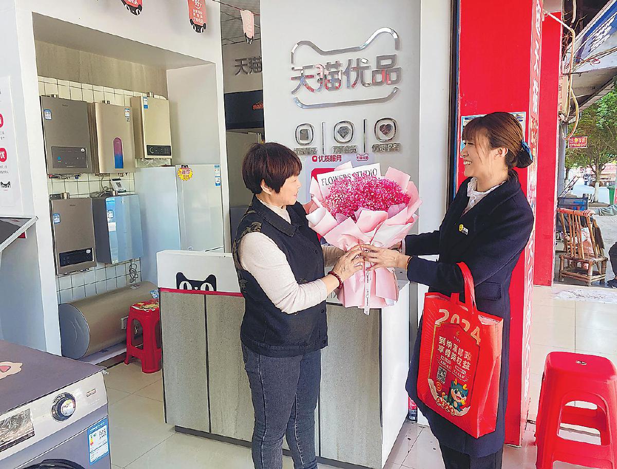 唐學(xué)梅(右)在節(jié)日里給大客戶送鮮花。
