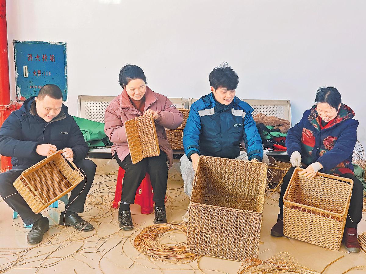 村民在浦北郵政鄉(xiāng)村振興示范基地內(nèi)編織竹藝制品?! 鯀怯老肌z