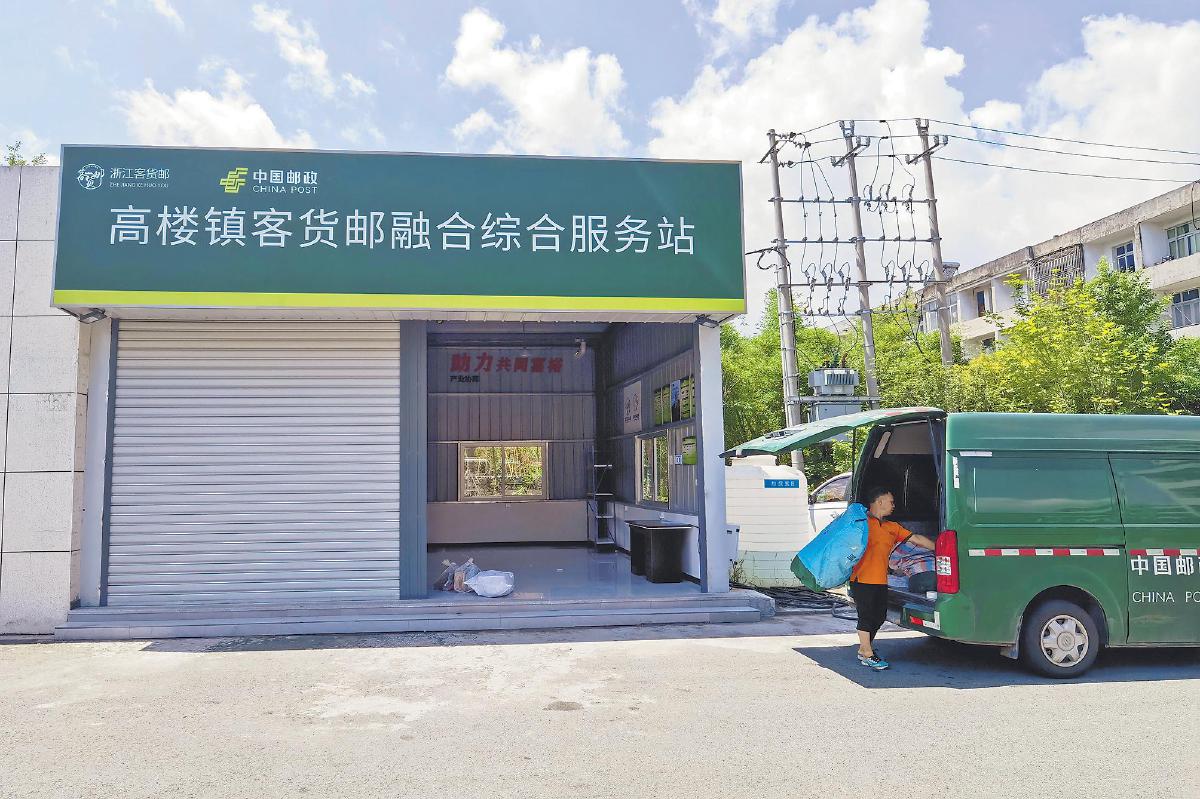 在浙江瑞安高樓鎮(zhèn)客貨郵融合綜合服務(wù)站,郵政投遞員正在裝卸郵件?! 趵罟荨z