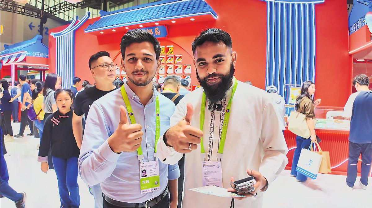 “消博郵局”推出的系列特色活動包括:邀請哪吒、敖丙等國漫IPcoser互動表演,海南漫畫家唐杰提供Q版自畫像定制服務,提供10款紀念戳供觀眾蓋戳打卡,辦理郵儲銀行信用卡贈露營車和“消博無憂寄”特惠券,滿額贈“黃金銀票”兌換禮品等,為參與者帶來沉浸式的文化體驗。圖為來自巴基斯坦的兩位觀展商為蓋戳打卡活動點贊。