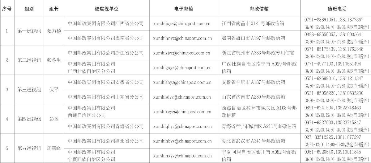 中國郵政集團有限公司黨組2025年第一批巡視進駐信息一覽表