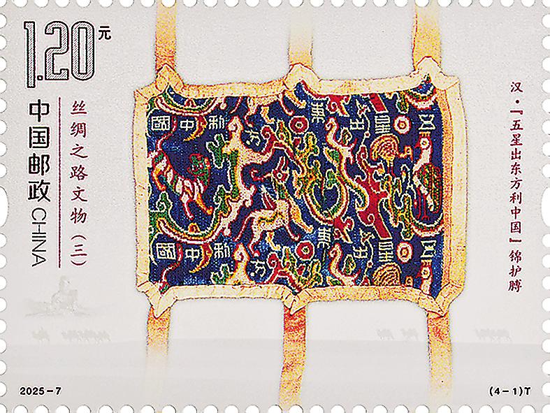 古絲綢之路綿亙?nèi)f里,延續(xù)千年,積淀了以和平合作、開(kāi)放包容、互學(xué)互鑒、互利共贏為核心的絲路精神,是人類(lèi)文明的寶貴遺產(chǎn)。該套郵票展現(xiàn)了陸上絲綢之路由西到東沿線的4件珍貴的文物。其中,“五星出東方利中國(guó)”錦護(hù)膊出土于絲綢之路南道交通要沖的尼雅遺址,為漢代射箭時(shí)所用護(hù)臂(射褙);神人紋銀盤(pán)出土于甘肅省靖遠(yuǎn)縣北灘,是中國(guó)絲綢之路上發(fā)現(xiàn)的重要羅馬文物;凸釘玻璃碗出土于寧夏固原市南郊的北周李賢夫婦合葬墓,該碗形制在薩珊時(shí)期的伊朗高原十分流行;胡人牽駝?shì)d絲壁畫(huà)出土于河南省洛陽(yáng)市安國(guó)相王孺人唐氏墓,生動(dòng)再現(xiàn)了各國(guó)商人來(lái)到絲綢之路的東方起點(diǎn)之一洛陽(yáng),裝載絲綢走上絲綢之路的場(chǎng)景。