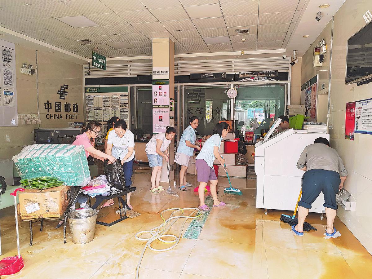 洪水退去,古州北路營(yíng)業(yè)所員工抓緊清掃大廳,準(zhǔn)備恢復(fù)營(yíng)業(yè)。
