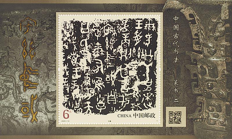 該套郵票精選5件文物,通過(guò)其青銅銘文與石刻文字拓片,傳遞千年篆韻。郵票采用膠雕套印工藝,內(nèi)圖底色通過(guò)立體雕刻紋路模擬拓印效果和質(zhì)感,邊飾顏色模擬紙張紋路,使郵票內(nèi)容更貼近真實(shí)拓印效果。小型張采用影寫印刷工藝,畫面清晰,層次豐富,通過(guò)全專色分色印刷提高郵票防偽性;圖內(nèi)“中國(guó)”二字設(shè)計(jì)為熒光效果,郵票邊飾“宅茲中國(guó)”采用金色直壓工藝,通過(guò)紋理效果體現(xiàn)青銅器歷史感,右側(cè)青銅器用色沉穩(wěn),層次鮮明,體現(xiàn)出“何尊”的神秘厚重感。