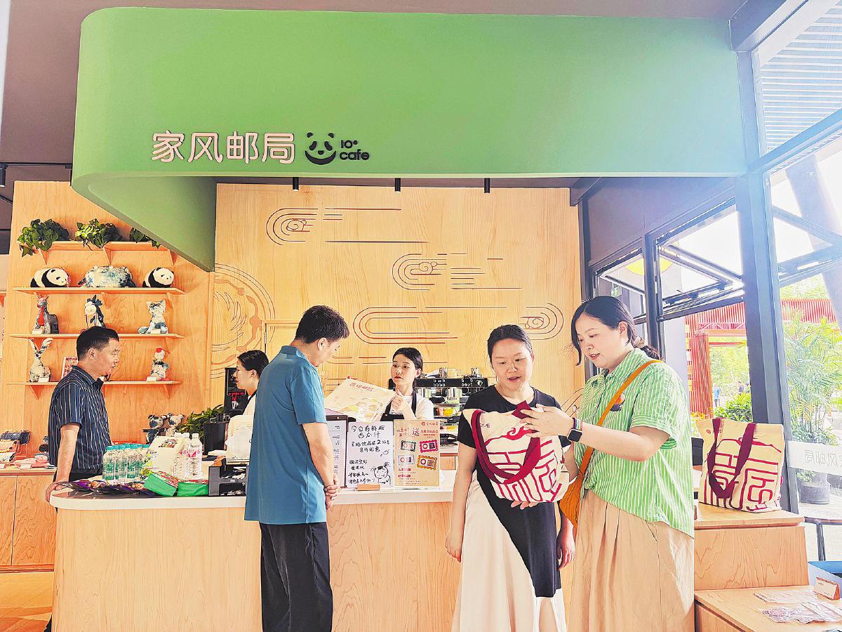 游客在熊貓家風(fēng)郵局選購(gòu)集郵文創(chuàng)產(chǎn)品。