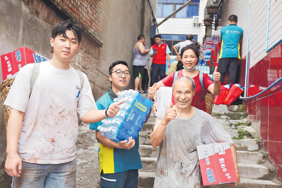 沒過多久,受災(zāi)居民陸續(xù)趕來。他們有的背著背簍,有的赤著腳,褲腳上沾滿了泥土,衣衫被汗水濕透。餐飲店經(jīng)營者丁平拿到物資后,連連道謝:“太感謝你們了,這些物資真是解了我的燃眉之急!”