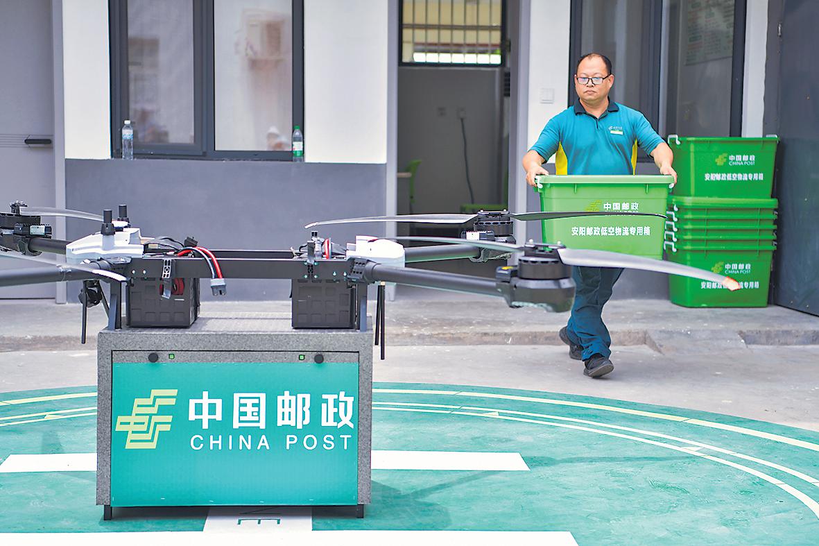 6月17日,在河南省林州市石板巖鎮(zhèn)郵政支局,伴隨著螺旋槳的嗡鳴聲,一架載重50公斤的無人機(jī)從停機(jī)坪騰空而起,載著郵件飛向海拔1300米的上坪村。7分鐘后,隨著無人機(jī)在上坪村的郵政低空物流驛站穩(wěn)穩(wěn)降落,河南首條無人機(jī)山區(qū)郵路正式投入常態(tài)化運營。
