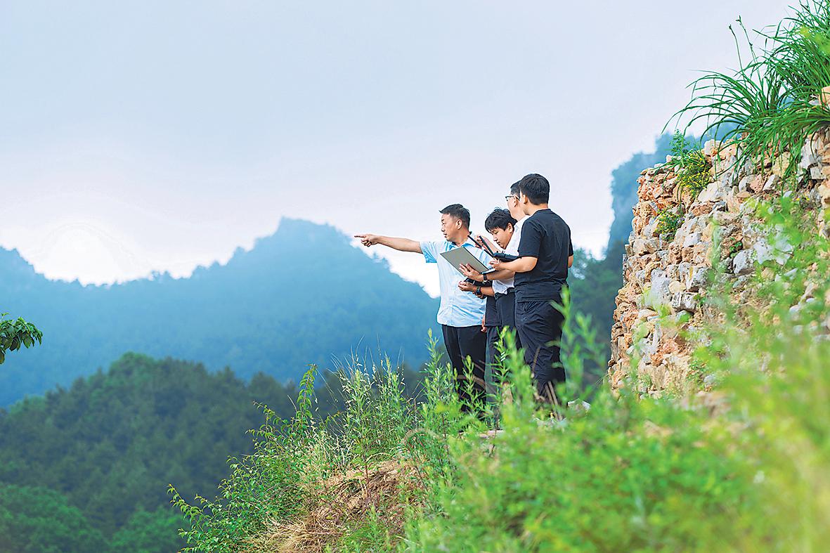 林州郵政工作人員與技術(shù)員在大垴村考察無人機(jī)起降點。