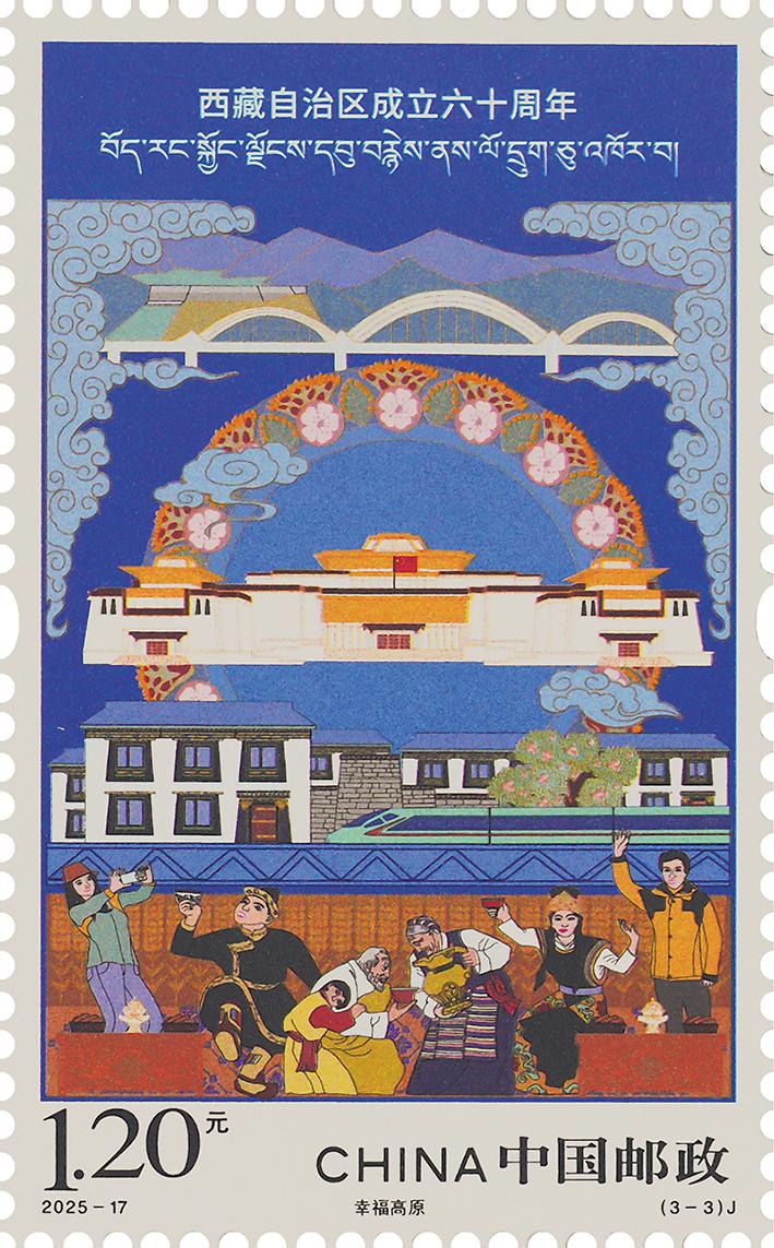 第三枚“幸福高原”,表現(xiàn)了西藏博物館、當(dāng)?shù)孛窬咏ㄖ?、拉林鐵路高鐵列車、拉薩河特大橋和旁多水庫等元素,安居樂業(yè)的人民和游客其樂融融,洋溢著幸福的笑容,展現(xiàn)出西藏的社會事業(yè)全面發(fā)展,民生福祉持續(xù)改善,群眾的獲得感、幸福感不斷增強(qiáng)的美好場景。