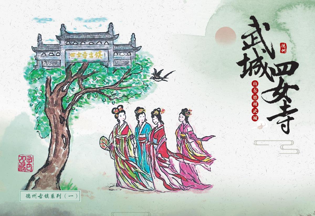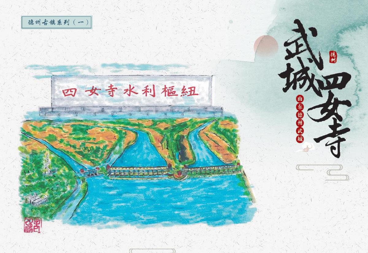 此次首發(fā)的文創(chuàng)產品涵蓋郵資封、明信片、郵資機宣傳戳及主題宣傳戳四大類,每一件都浸潤著四女寺的文化基因。其中,“四女”郵資封(右上圖)以工筆重彩呈現(xiàn)經典場景:畫面中四位女子于槐樹下漫步,旁側牌坊古樸,飛鳥點綴天際,還原“四女侍親,栽槐立誓”的民間傳說,四女常伴樹側,行孝事、話桑麻,樹與人相襯成景,演繹著傳統(tǒng)孝道的溫度,讓古老美德在時光里熠熠生輝,供后人感懷、傳揚;而“四女寺水利樞紐”明信片(右下圖)則通過航拍視角與細節(jié)特寫的結合,展現(xiàn)這座黃河下游重要水利工程的宏偉氣勢——堤壩蜿蜒如巨龍伏波,閘門啟閉間盡顯古人治水的智慧結晶,讓現(xiàn)代觀者得以觸摸歷史的溫度。