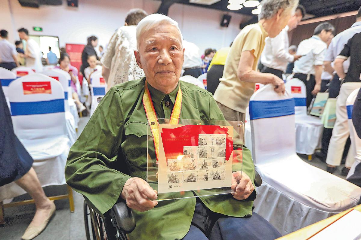 在上海四行倉庫抗戰(zhàn)紀(jì)念館隆重舉行的發(fā)行儀式上,主辦方向抗戰(zhàn)老戰(zhàn)士及家屬等贈送了紀(jì)念郵品?! 踉S雨舟 攝影報道