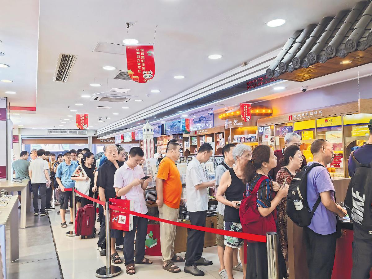 抗戰(zhàn)勝利80周年紀(jì)念郵票發(fā)行當(dāng)日,重慶市解放碑主題郵局排起了長隊(duì)。□魏馨 攝影報道