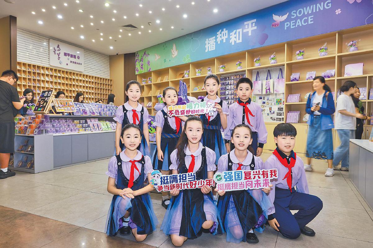 9月3日下午,江蘇省郵政分公司聯(lián)合侵華日軍南京大屠殺遇難同胞紀(jì)念館舉辦抗戰(zhàn)勝利80周年紀(jì)念郵票發(fā)行儀式。圖為在活動現(xiàn)場表演節(jié)目的學(xué)生代表來到和平郵局打卡留念。□柏濱豐 攝影報道