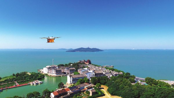 8月19日,在安徽省合肥市巢湖上空,無(wú)人機(jī)在配送快遞包裹(無(wú)人機(jī)照片)。
