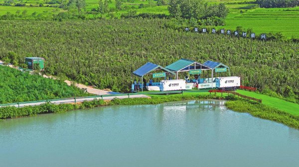 8月21日,在安徽省六安市霍邱縣元圩瓜果種植專業(yè)合作社,郵政無(wú)人車在拉運(yùn)郵政電商直播賣出的秋月梨(無(wú)人機(jī)照片)。