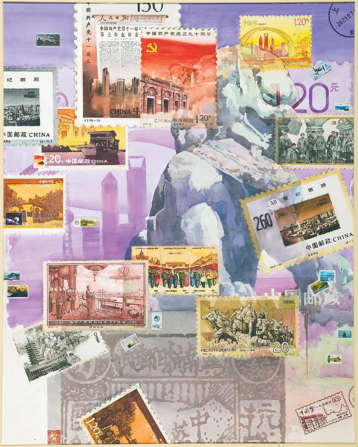 從郵票圖案的細(xì)節(jié)還原,到色彩色調(diào)的精準(zhǔn)把控,田燕萍始終追求用匠心打磨精品。她借鑒“蒙太奇”電影手法,用繪畫(huà)串聯(lián)起不同時(shí)代的郵票;背景特意繪制故宮石獅雕像,象征“蘇醒的雄獅”;底色選用紫色,取“紫氣東來(lái)”的吉祥寓意。每一處設(shè)計(jì)、每一筆勾勒,都藏著她對(duì)品質(zhì)的追求。