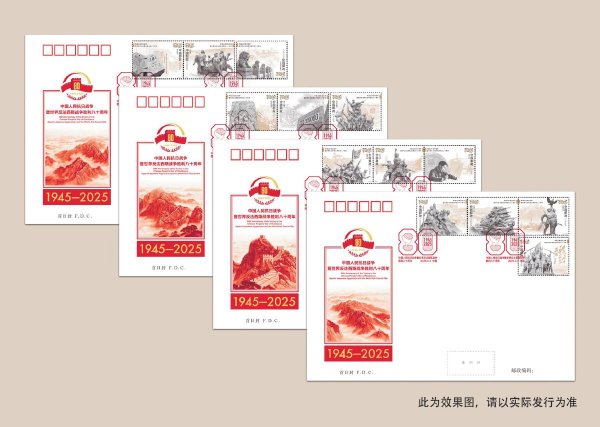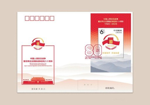 圖為《中國(guó)人民抗日戰(zhàn)爭(zhēng)暨世界反法西斯戰(zhàn)爭(zhēng)勝利八十周年》首日封和小型張首日封。(此為效果圖,請(qǐng)以實(shí)際發(fā)行為準(zhǔn))