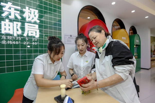 身高3.2米的吉祥物小熊“東吉吉”身挎綠郵包快樂招手,憨態(tài)可掬;業(yè)務受理、產(chǎn)品展示、書寫打印、自助體驗、政務圖書銷售等特色服務豐富貼心,各種產(chǎn)品琳瑯滿目。在邊境地區(qū)看到這樣功能齊全、特色鮮明的主題郵局,采訪組驚喜不已。