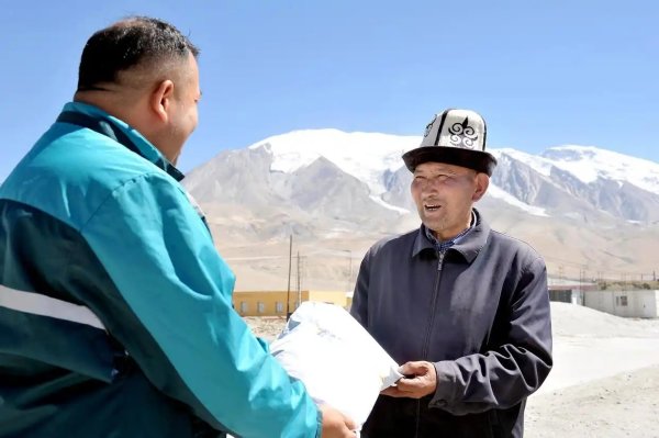 投遞員阿克阿不都賽米·賽買提(左)把包裹送到新疆克孜勒蘇柯爾克孜自治州阿克陶縣布倫口鄉(xiāng)布倫口村夏迪別克·排爾慢手中。郵路延伸到雪山腳下,讓生活在邊疆的各族民眾也能享受到和城市居民一樣快捷方便的郵政服務(9月9日攝)。新華社發(fā)