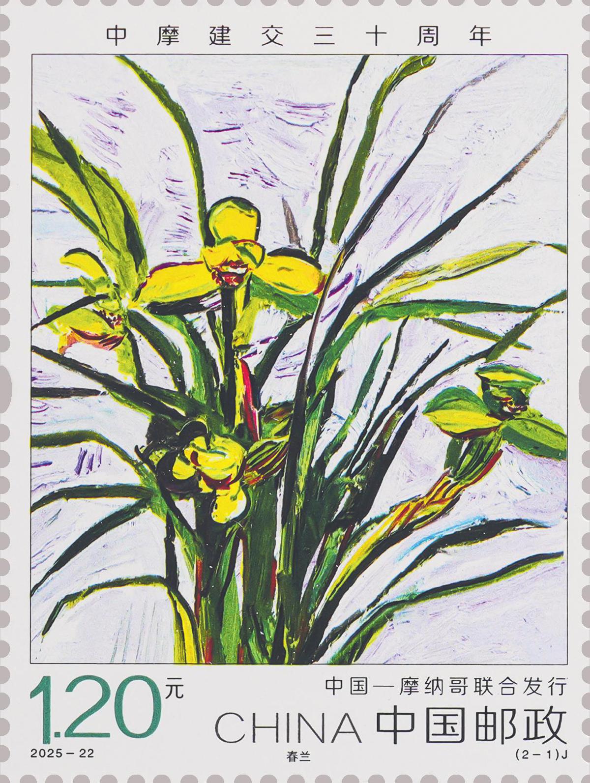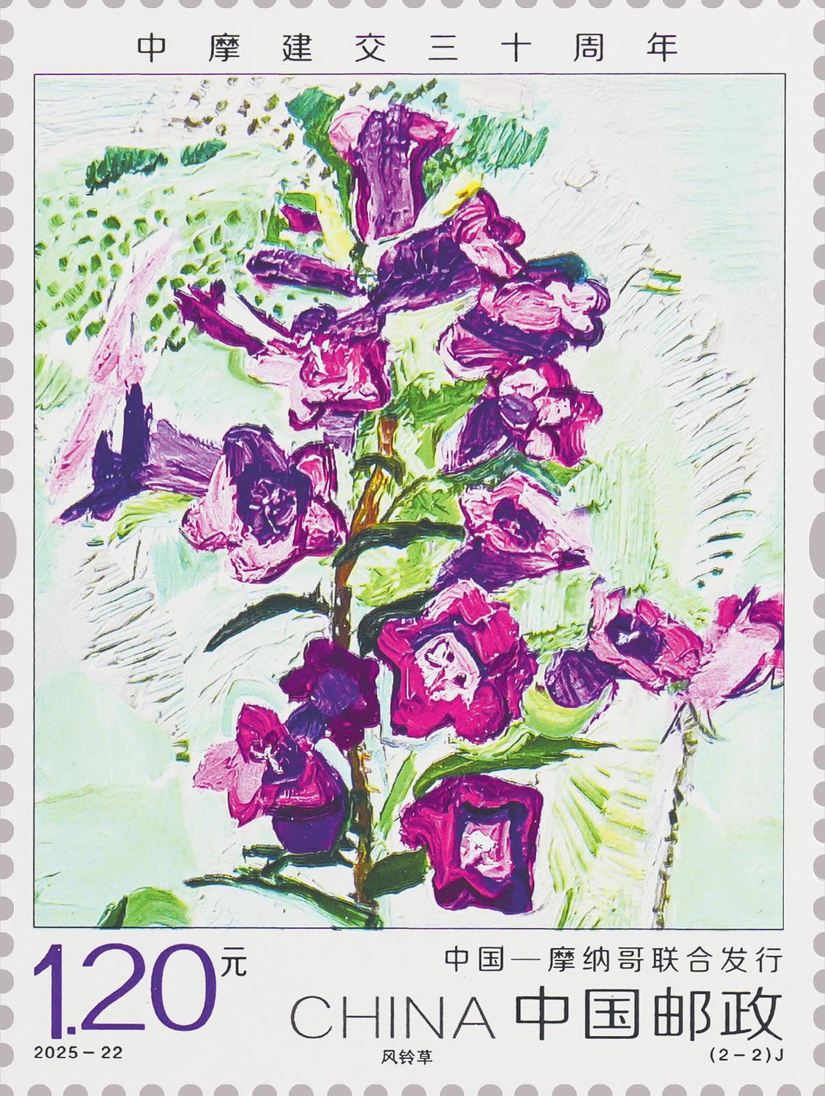 本套郵票分別選用具有兩國民族特色和深厚文化內(nèi)涵的花卉,中國選用栽培歷史悠久的春蘭,摩納哥選用美麗靈動的風(fēng)鈴草,兩種花卉彰顯出生態(tài)文明的內(nèi)在價值與精神追求。郵票圖案采用油畫表現(xiàn)方式,設(shè)計師通過大膽的構(gòu)圖、恣意的筆觸、靈活的色彩搭配,對具體的物象進(jìn)行抽象提煉,從而營造出一種生動而富有生命力的畫面效果。兩枚郵票承載著“友誼長存”的深層寓意,希望中摩關(guān)系不斷取得新進(jìn)展,更好造福兩國人民。