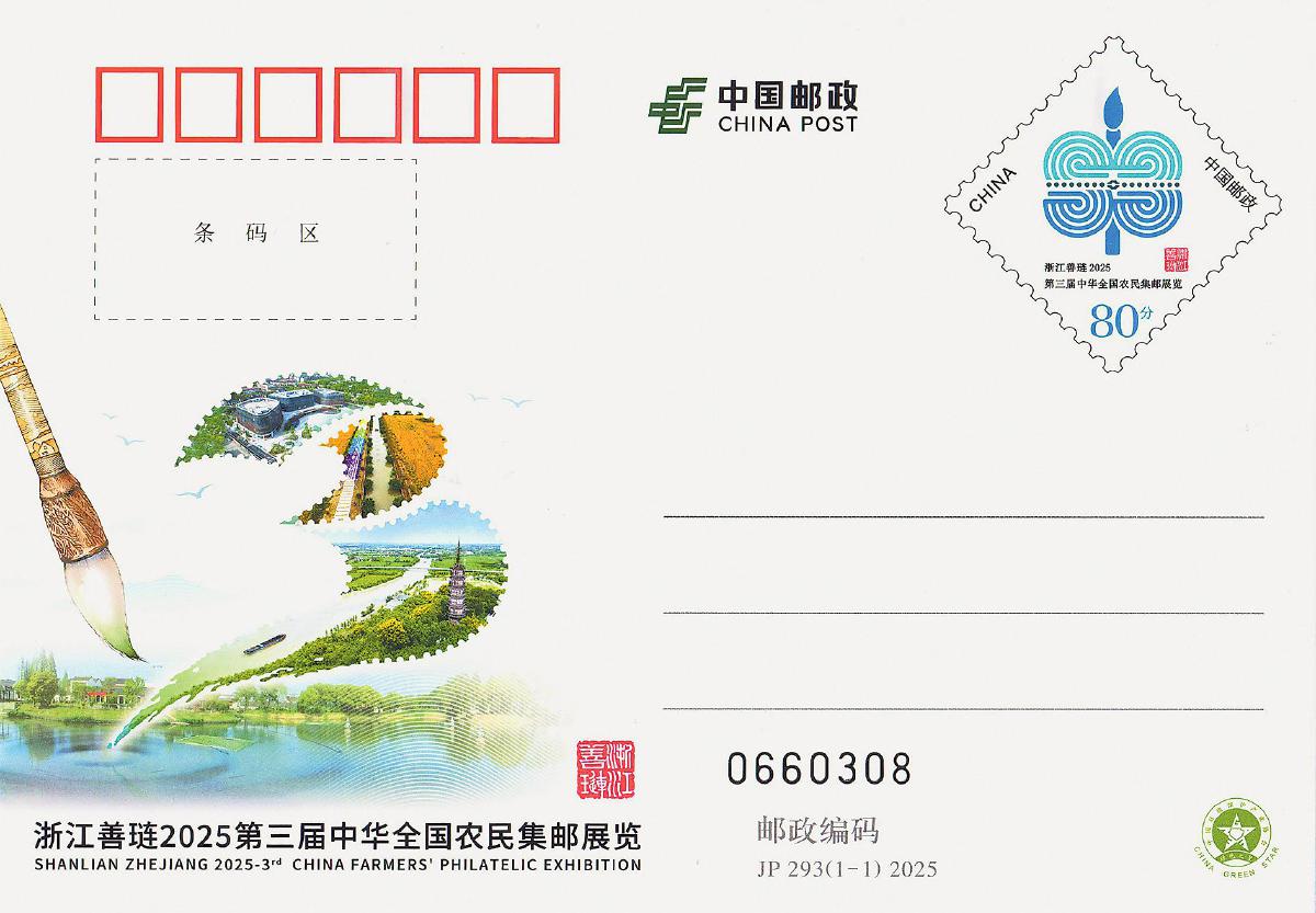 展覽集中展示全國28個(gè)省級(jí)郵協(xié)精選的146部、450框“三農(nóng)”題材郵集,涵蓋傳統(tǒng)、郵政歷史、專題等10個(gè)競賽類別,特別增設(shè)19部、30框書信集郵非競賽單元。中國郵政為本次郵展特別發(fā)行《浙江善璉2025第三屆中華全國農(nóng)民集郵展覽》紀(jì)念郵資明信片1枚。