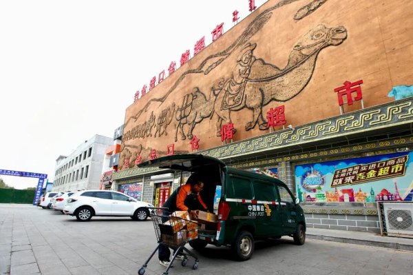在二連浩特市的垚金進口倉儲超市里,攬收員廖海雨一天兩次來攬收郵件,使游客們買到的商品能夠當天發(fā)出直發(fā)回家。
