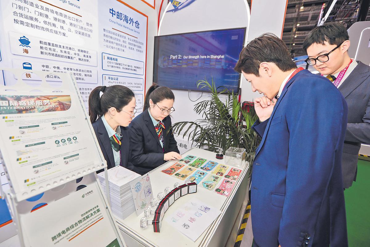 11月5日—10日,第八屆中國(guó)國(guó)際進(jìn)口博覽會(huì)(以下簡(jiǎn)稱(chēng)“進(jìn)博會(huì)”)在上海舉行。本屆進(jìn)博會(huì)有155個(gè)國(guó)家、地區(qū)和國(guó)際組織參與,4108家境外企業(yè)參展,規(guī)模再創(chuàng)新高。上海市郵政分公司特為本屆進(jìn)博會(huì)啟用并發(fā)行了《第八屆中國(guó)國(guó)際進(jìn)口博覽會(huì)》YFM118E型郵資機(jī)戳和紀(jì)念封各1枚,受到廣大集郵愛(ài)好者和參展觀眾的歡迎。同時(shí),中國(guó)郵政EMS連續(xù)第八年受邀參展,展示了其全球寄遞網(wǎng)絡(luò)、境外倉(cāng)配矩陣等六大板塊成果,呈現(xiàn)郵政從“郵商并舉”向“郵商貨倉(cāng)并進(jìn)”的轉(zhuǎn)型路徑,為跨境貿(mào)易提供全鏈條解決方案。圖為觀眾被EMS展位上的特色明信片所吸引。