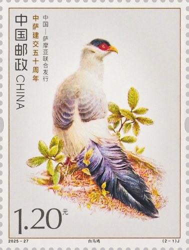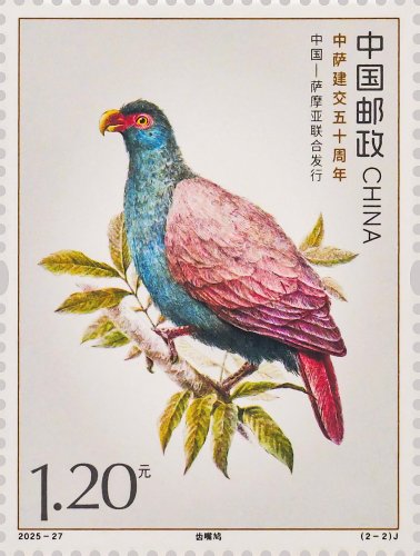 本套郵票以兩國的特色鳥類為核心設(shè)計元素,融西方鋼筆線條與東方淡彩的表現(xiàn)技法,筆觸細膩傳神,形象生動逼真,兩只禽鳥顧盼相應(yīng)、神氣貫連,洋溢著蓬勃的生命力。本套郵票既展現(xiàn)兩國獨特的自然生態(tài)之美,更傳遞出兩國友誼的深厚底蘊與美好未來。第一枚郵票表現(xiàn)了白馬雞。作為四川丹巴莫斯卡鳥類重要棲息地的主要保護物種,白馬雞也成為丹巴自然生態(tài)的鮮活代表,當?shù)鬲毺氐母咴瓪夂?、適宜的生態(tài)環(huán)境為其提供了理想生存空間。第二枚郵票表現(xiàn)了齒嘴鳩。作為薩摩亞的本土特有鳥類,齒嘴鳩不僅是當?shù)厣鷳B(tài)系統(tǒng)的重要成員,更被視為薩摩亞自然與文化遺產(chǎn)的象征,承載著薩摩亞人民對家鄉(xiāng)土地的熱愛與珍視。