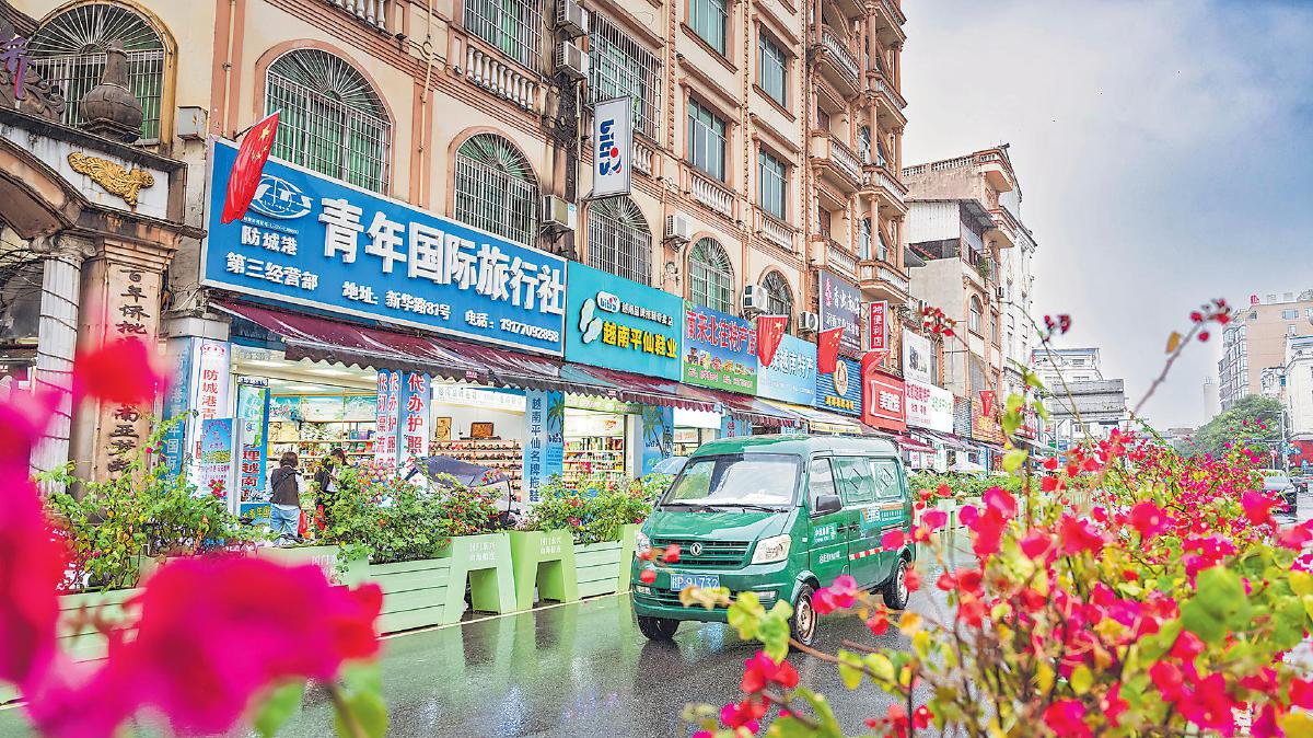 郵車(chē)穿行于東興市邊貿(mào)街區(qū)的商鋪間。