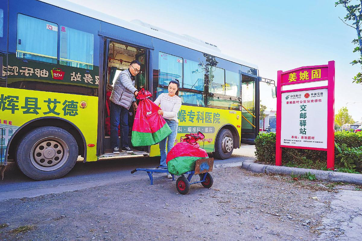 公交司機(jī)將集好包的快遞交到了姜姚固村郵政便民服務(wù)站負(fù)責(zé)人關(guān)亞杰手中。