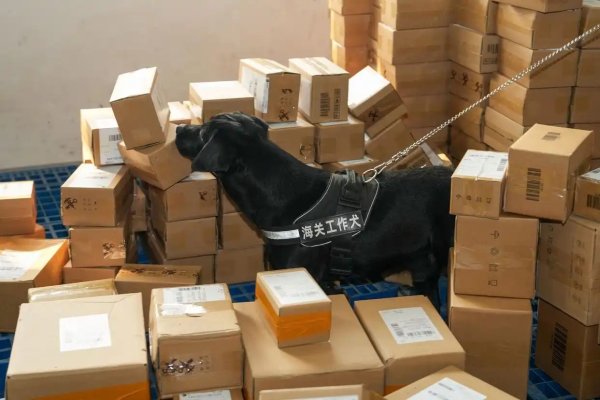 12月10日,海關(guān)工作犬在長(zhǎng)沙國(guó)際郵件互換局查驗(yàn)進(jìn)口包裹。
