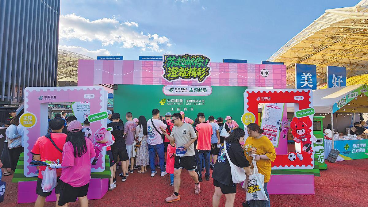 無錫市分公司在“蘇超”江陰賽區(qū)比賽現(xiàn)場設(shè)置的臨時郵局大受歡迎。 □黃棟粱 攝