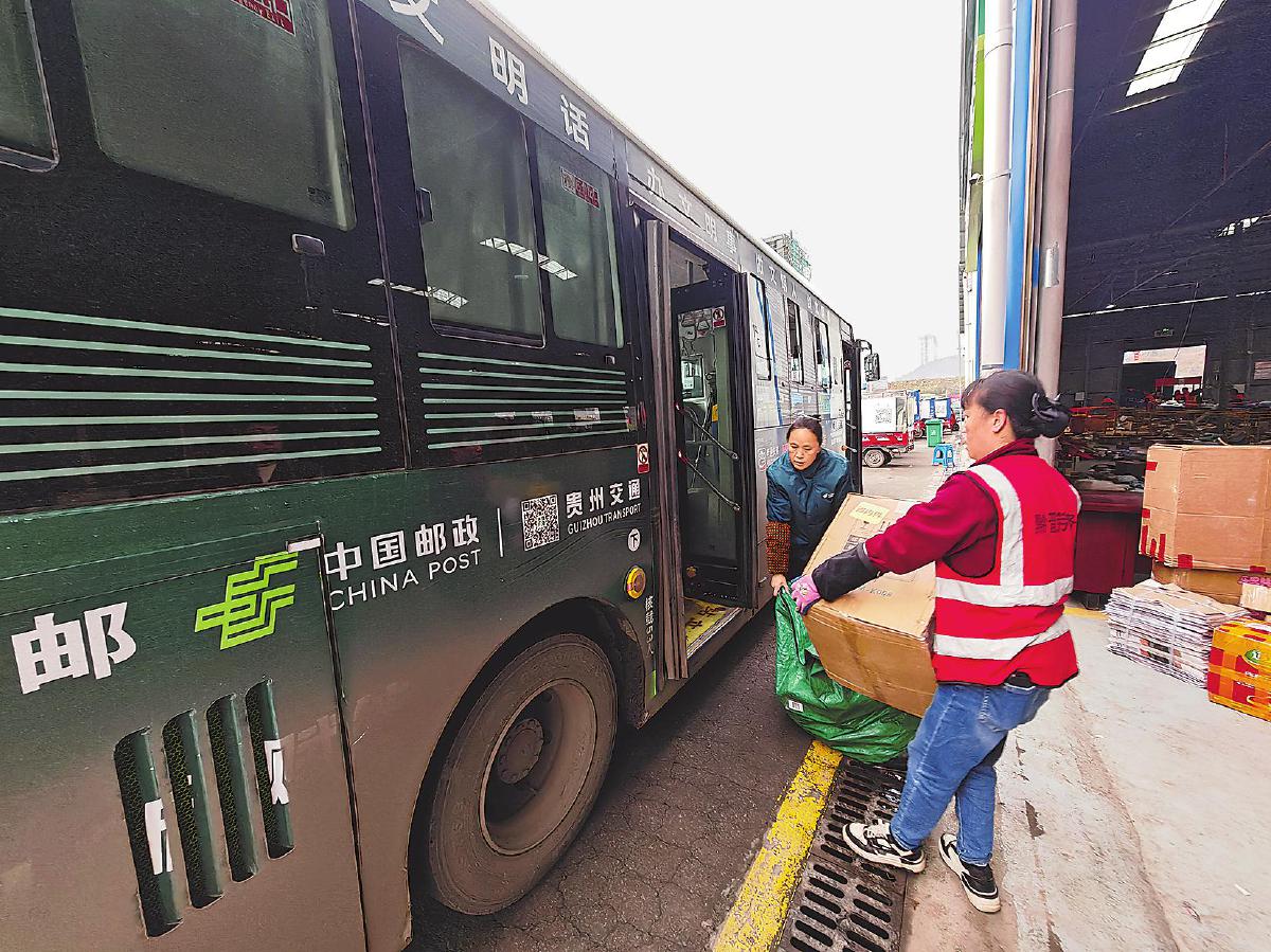 在貴州省黔西市寄遞物流共配中心,郵政工作人員將郵件送上客貨郵專線客車?!蹴n靜樺 攝