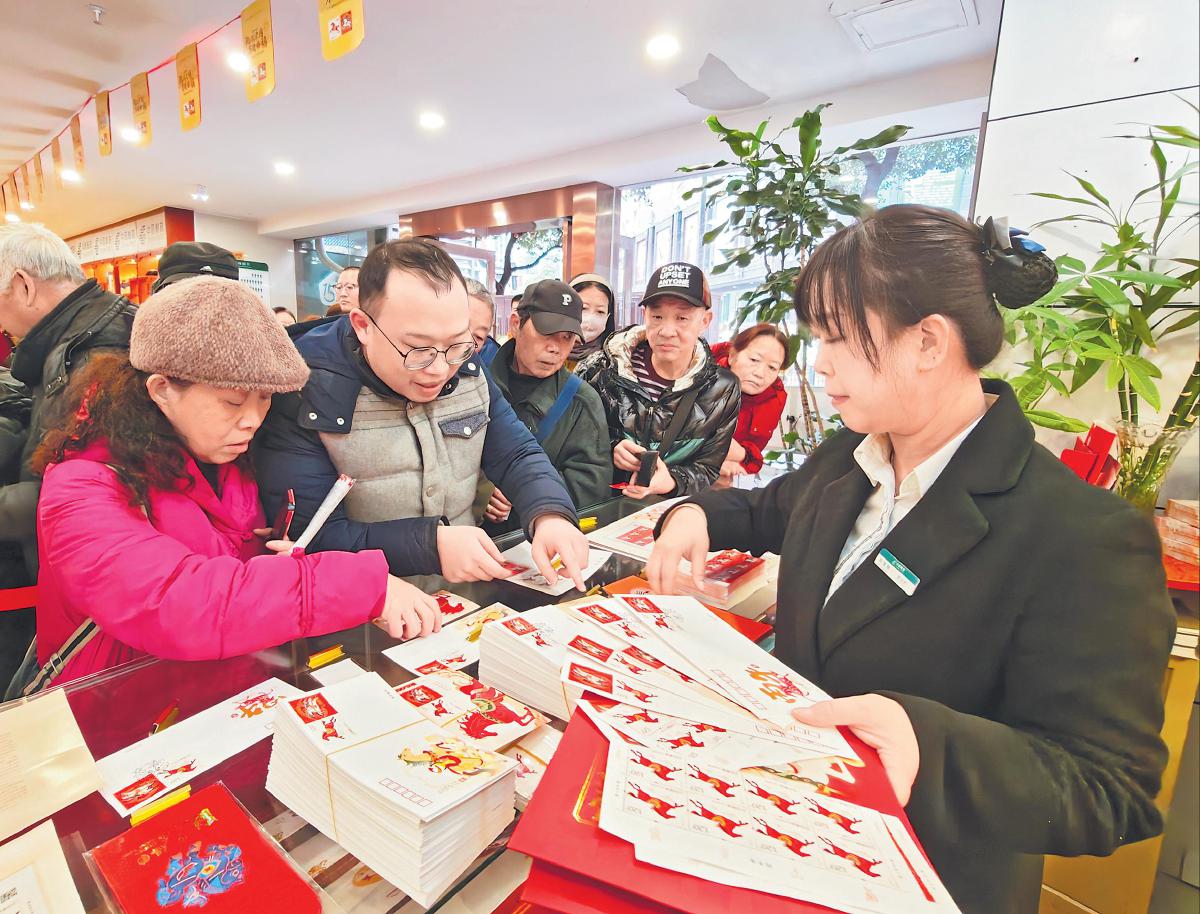 1月5日,《丙午年》特種郵票全國發(fā)行,以“馳躍宏圖、萬駿臻福”的文化意象,將傳統(tǒng)生肖底蘊與時代活力傳遍全國。各地郵政營業(yè)網(wǎng)點聯(lián)動構(gòu)建生肖文化傳播矩陣,讓這套承載奮進(jìn)寓意與吉祥期許的“國家名片”,成為“十五五”開局之際的全國性文化熱點。老郵迷品鑒方寸匠心,年輕人追捧文創(chuàng)潮流,掀起全民集藏?zé)岢?。圖為貴州省貴陽市噴水池郵政營業(yè)所工作人員熱情地向市民講解馬年生肖郵票的設(shè)計理念與印制特色。此外,該營業(yè)所還特別準(zhǔn)備了開陽馬場生肖原地戳等特色紀(jì)念郵戳,切實滿足廣大郵迷需求。